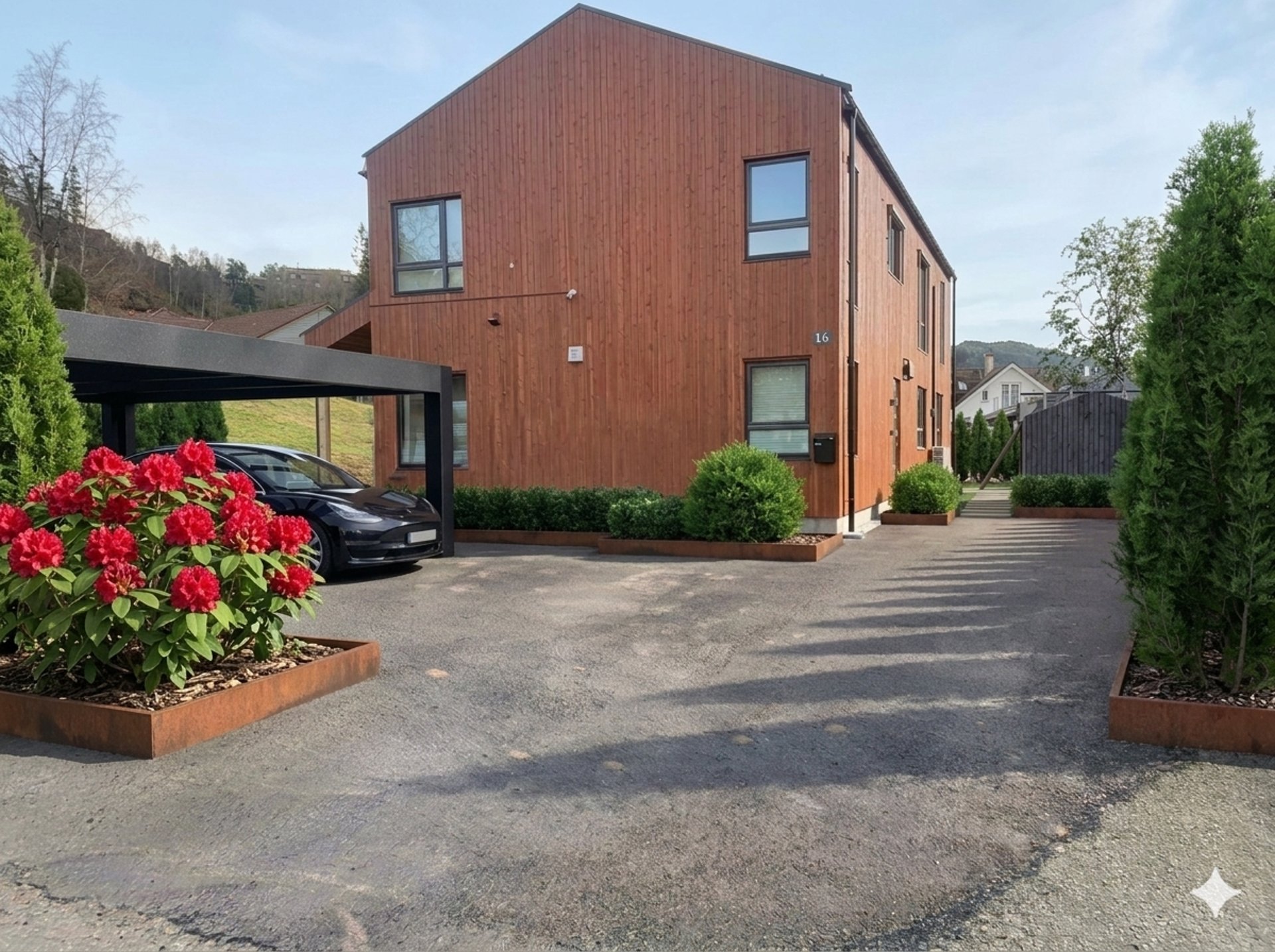 Kunden ønsket en uteområde med lavt vedlikeholdsbehov, et begrenset utvalg av planter, en plen for lek, bedre skjerming mot naboer og en dobbel carport. Designet inkluderer en slitesterk plen, strategisk plasserte hekker og trær for innsynsskjerming, samt en funksjonell carport for to biler. Den eksisterende boden er integrert i planen, noe som skaper et praktisk og harmonisk uterom. Resultatet er et enkelt og funksjonelt uteområde som oppfyller kundens behov for enkelt vedlikehold.